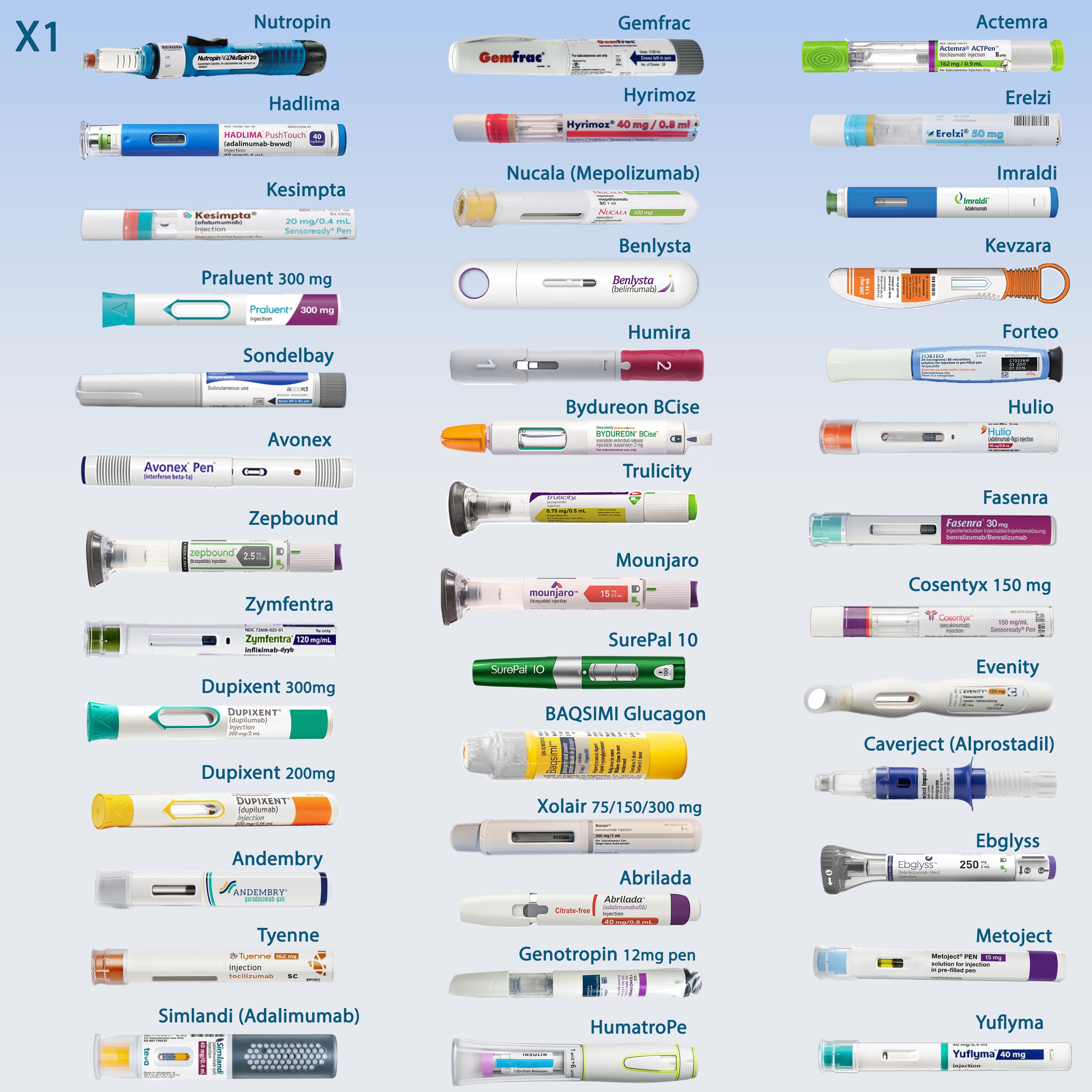 •  1 Unit of Actemra pen, Avonex pen, Belysta pen, Bydureon BCise pen, Entyvio pen, Erelzi pen, Fasenra pen, Forteo pen, Gemfrac pen, Hadlima pen, Humira pen, Imraldi pen, Kevzara pen, Kesimpta pen, Mounjaro pen, Norditropin Nordiflex pen, Norditropin pen, Nucala pan, Nutropin pen, Praluent 300 mg pen, Sondelbay pen, Trulicity pen, Zepbound pen, and similar-size injectables.