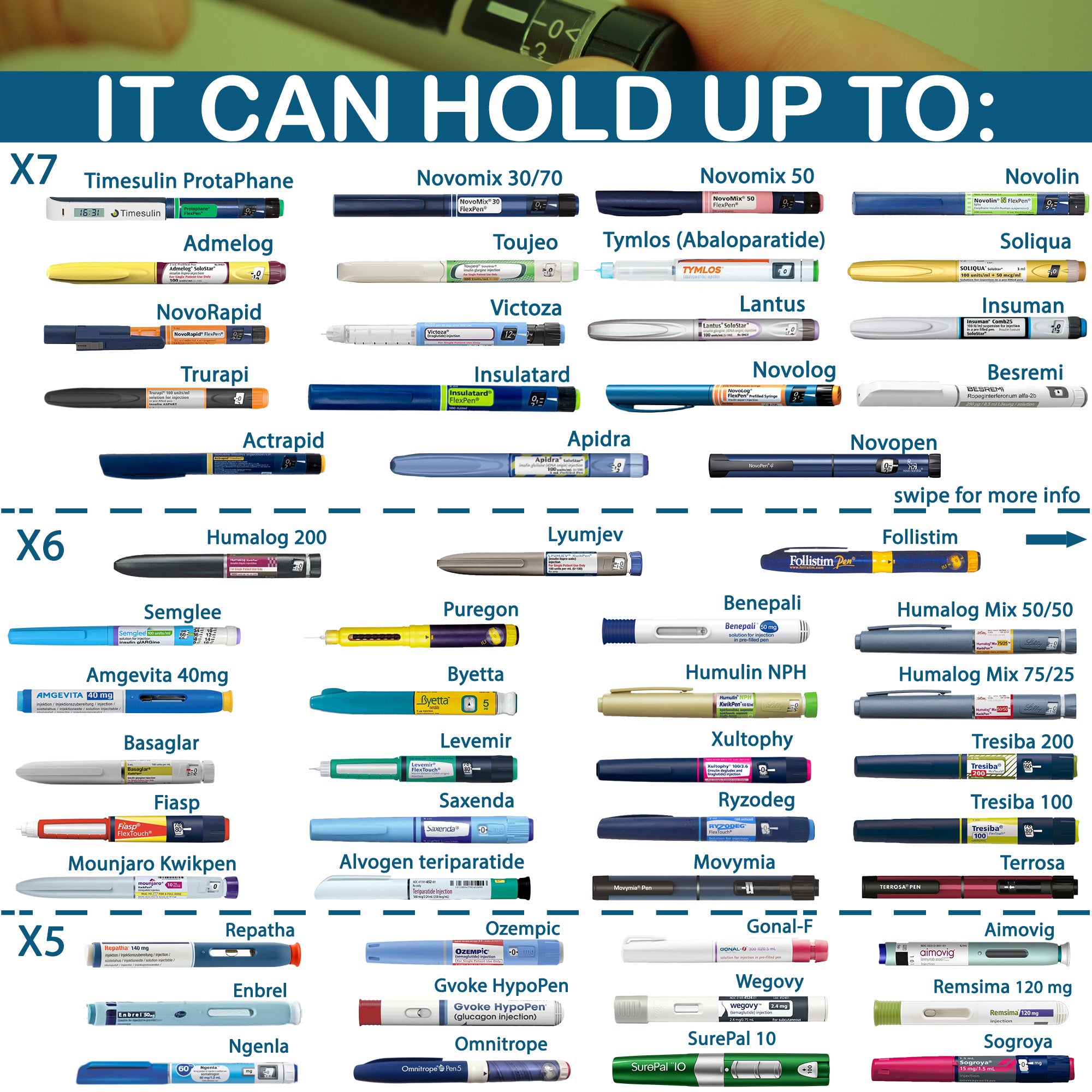 Humalog, Humulin, Lantus, Levimir, Lyumjev, Novolin, Novolog, Novorapid, Ryzodeg, Toujeo, Tresiba, Velosulin, Xultopy...
