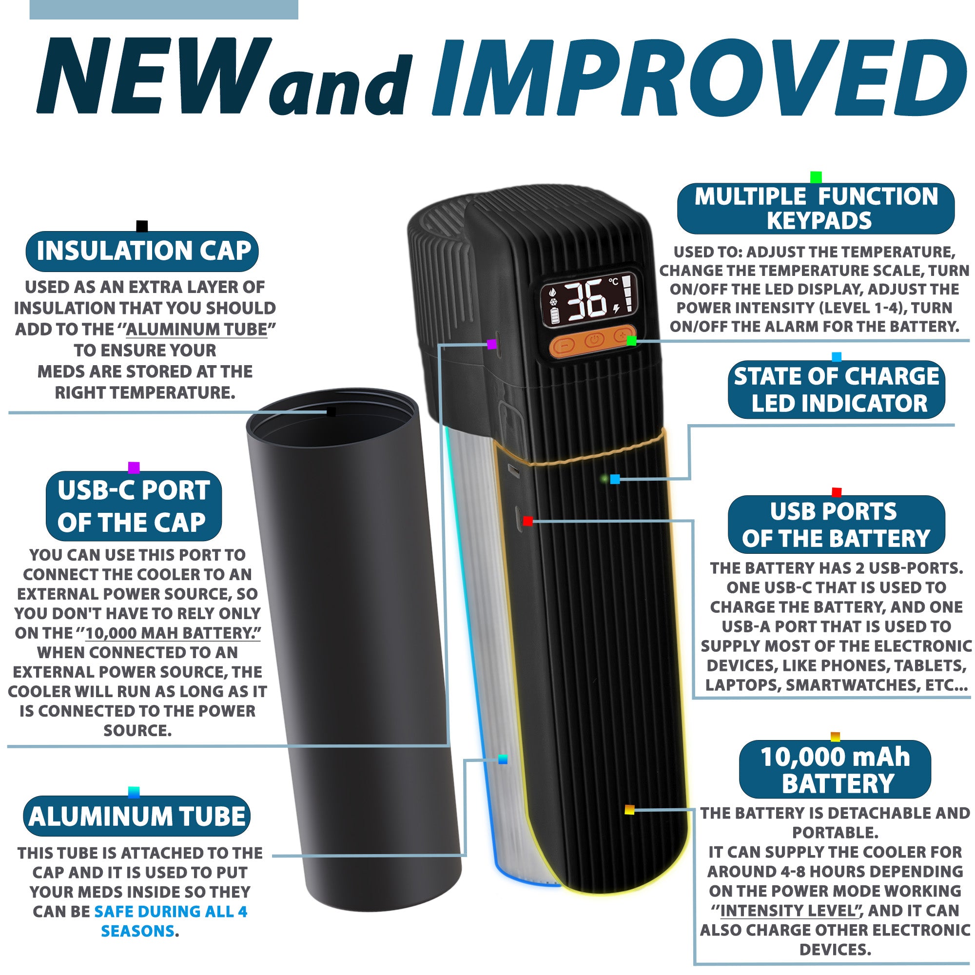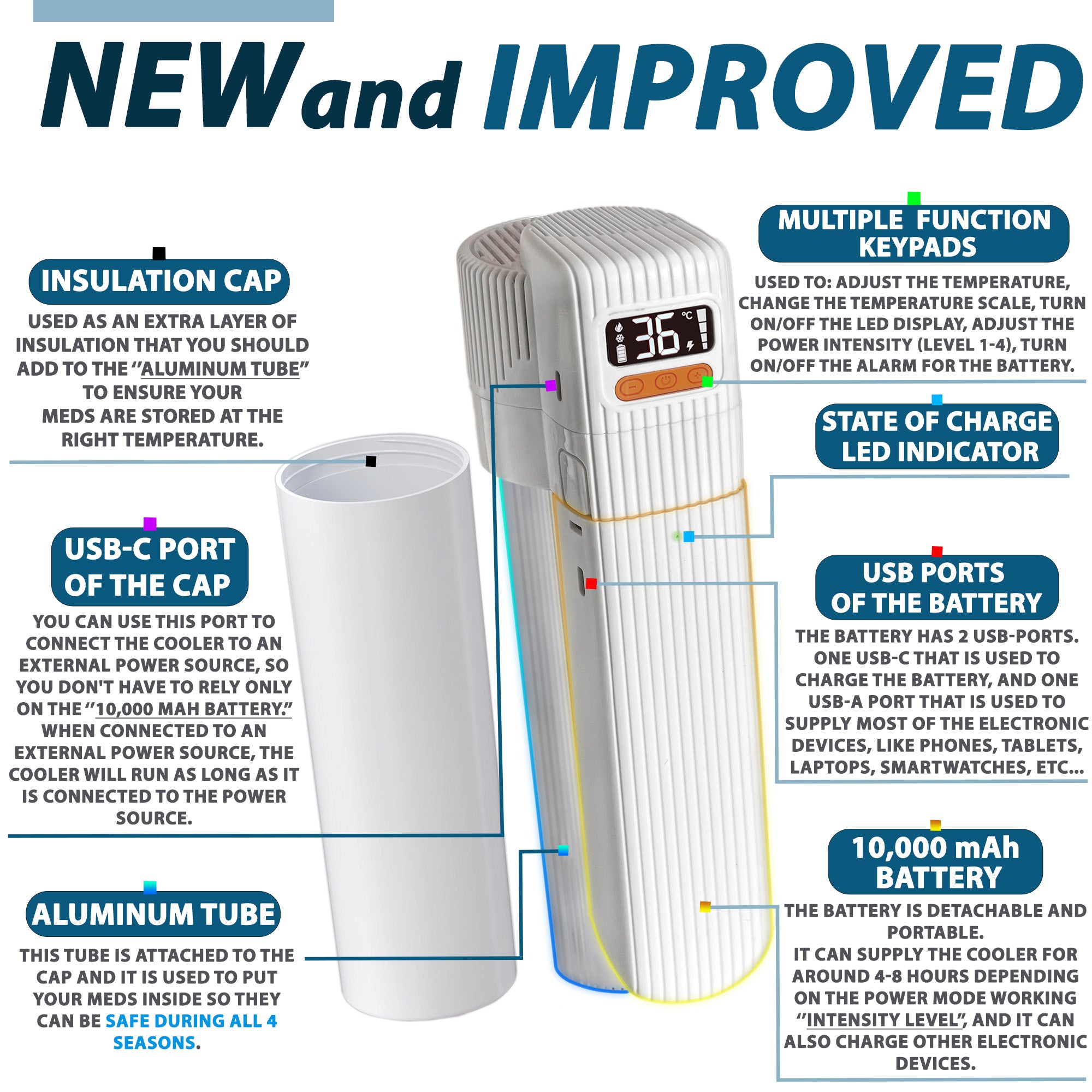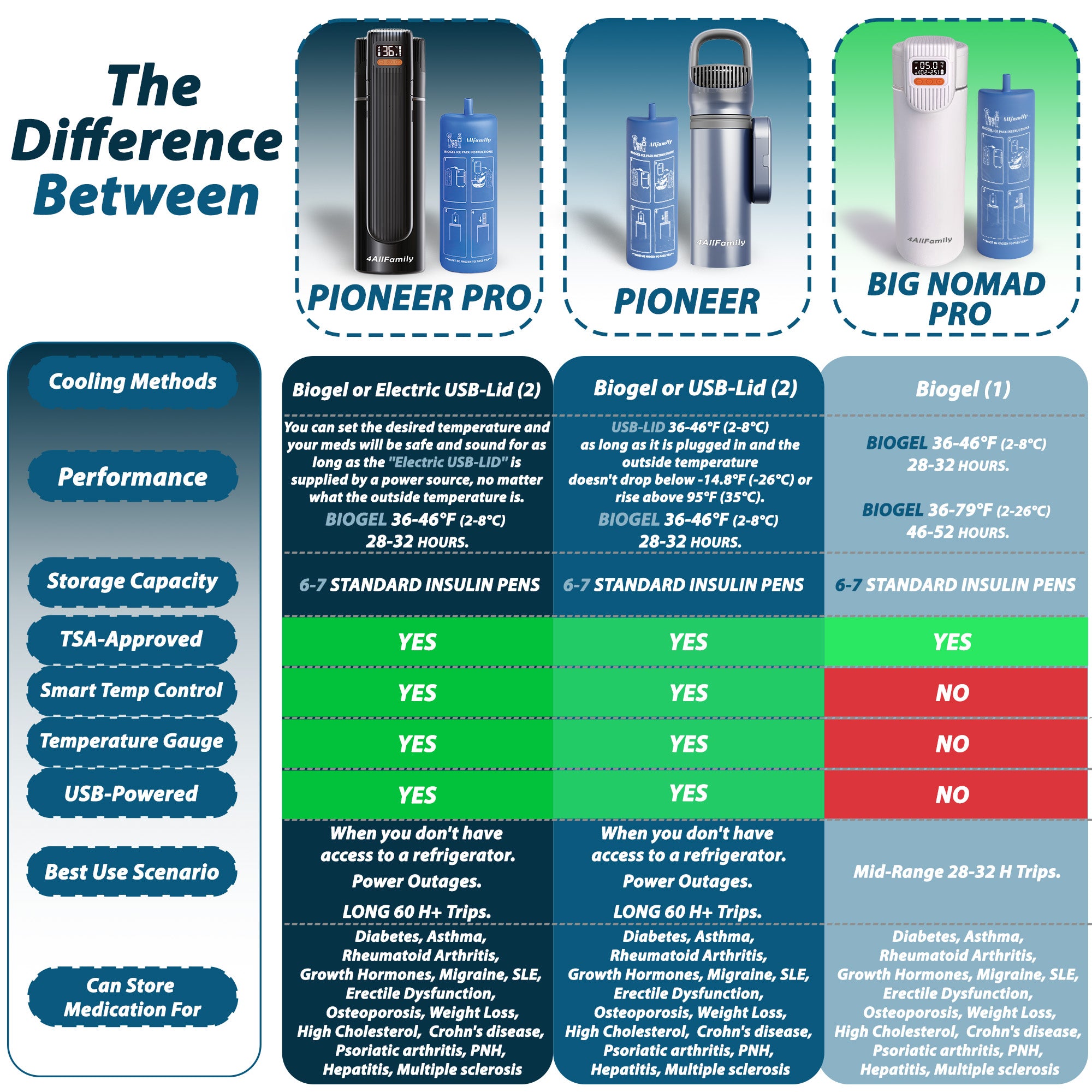 Die 4ALLFAMILY Pioneer PRO Insulin-Kühltasche ist eine hochwertige, reisefertige Kühllösung für Medikamente und Insulin. Sie hält temperaturempfindliche Medikamente unterwegs zuverlässig auf einer sicheren, konstanten Temperatur. Ob Insulinpens, GLP-1-Medikamente, Epinephrin-Pens oder andere Biologika – diese TSA-zugelassene Insulin-Reisetasche sorgt dank innovativer USB-betriebener aktiver Kühlung und passivem Biogel-Kühlsystem für optimalen Schutz über viele Stunden.